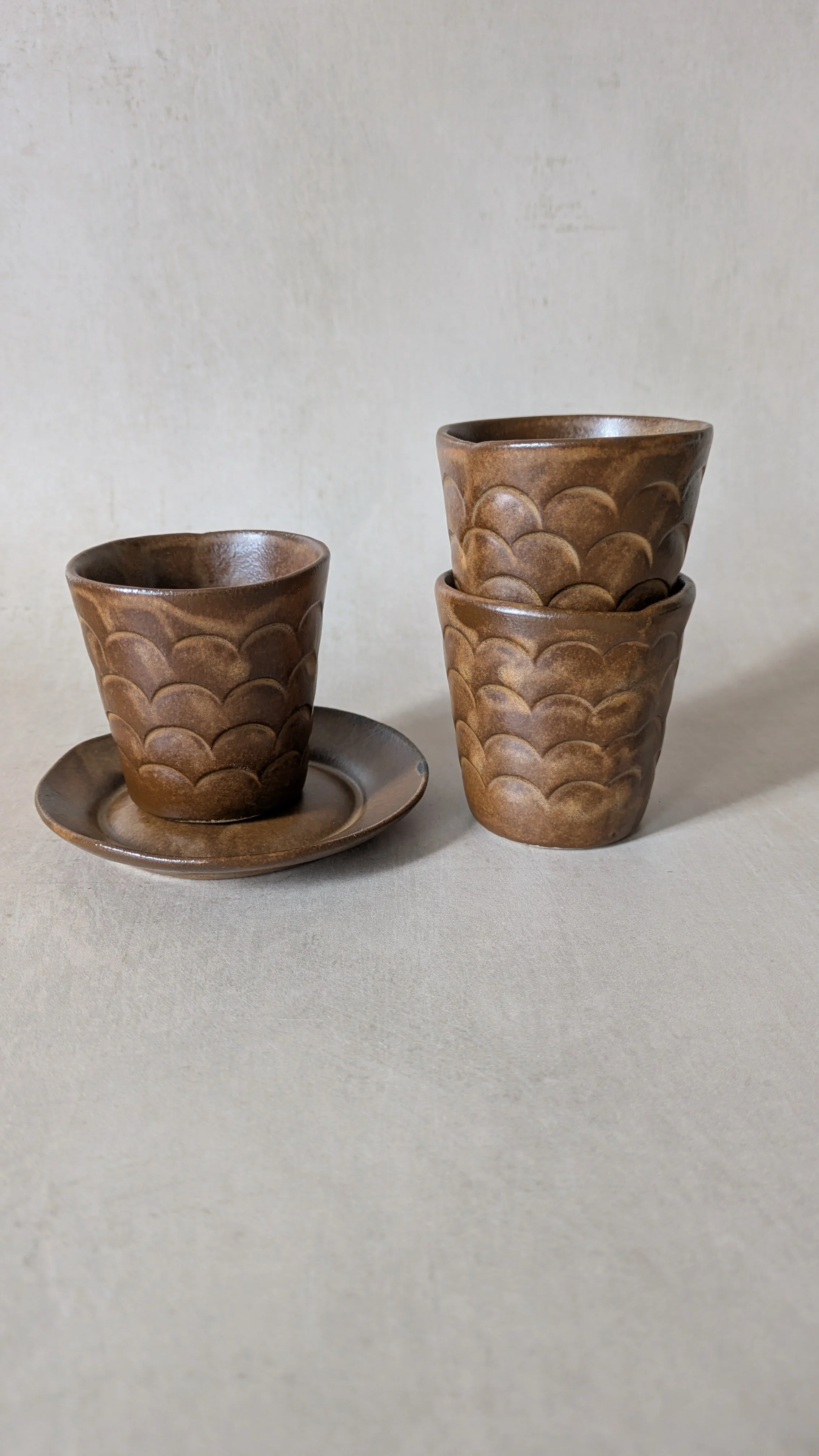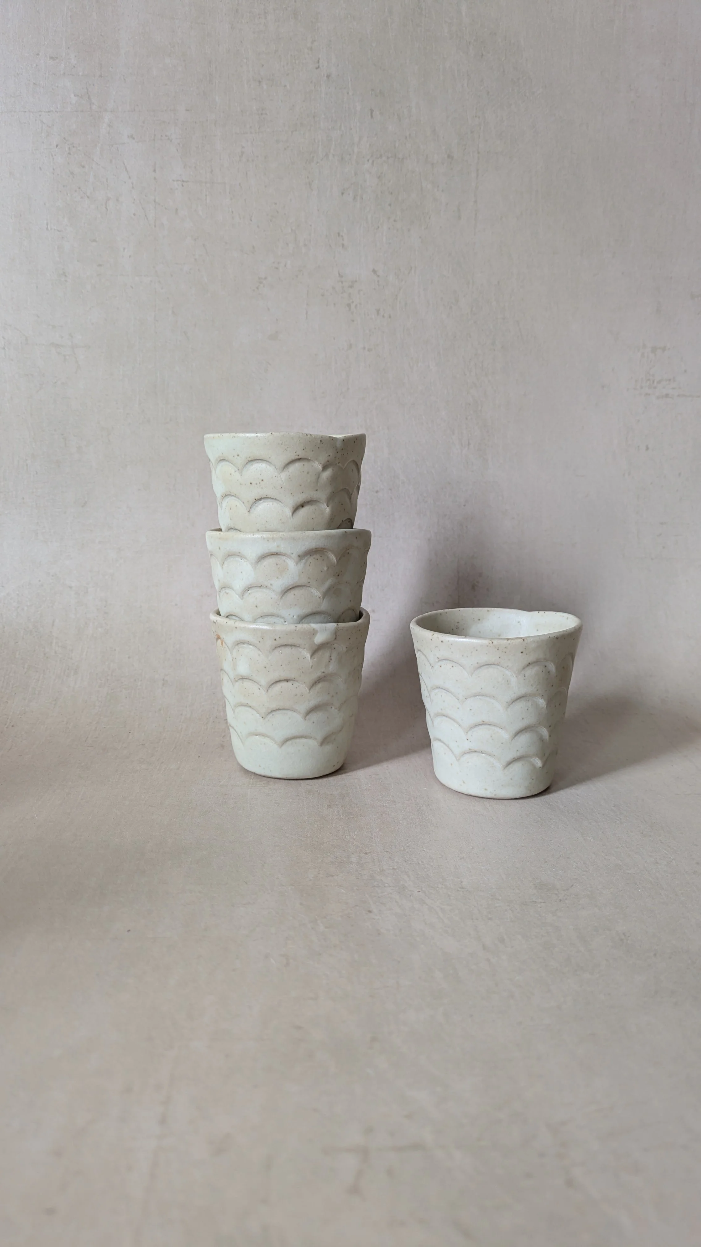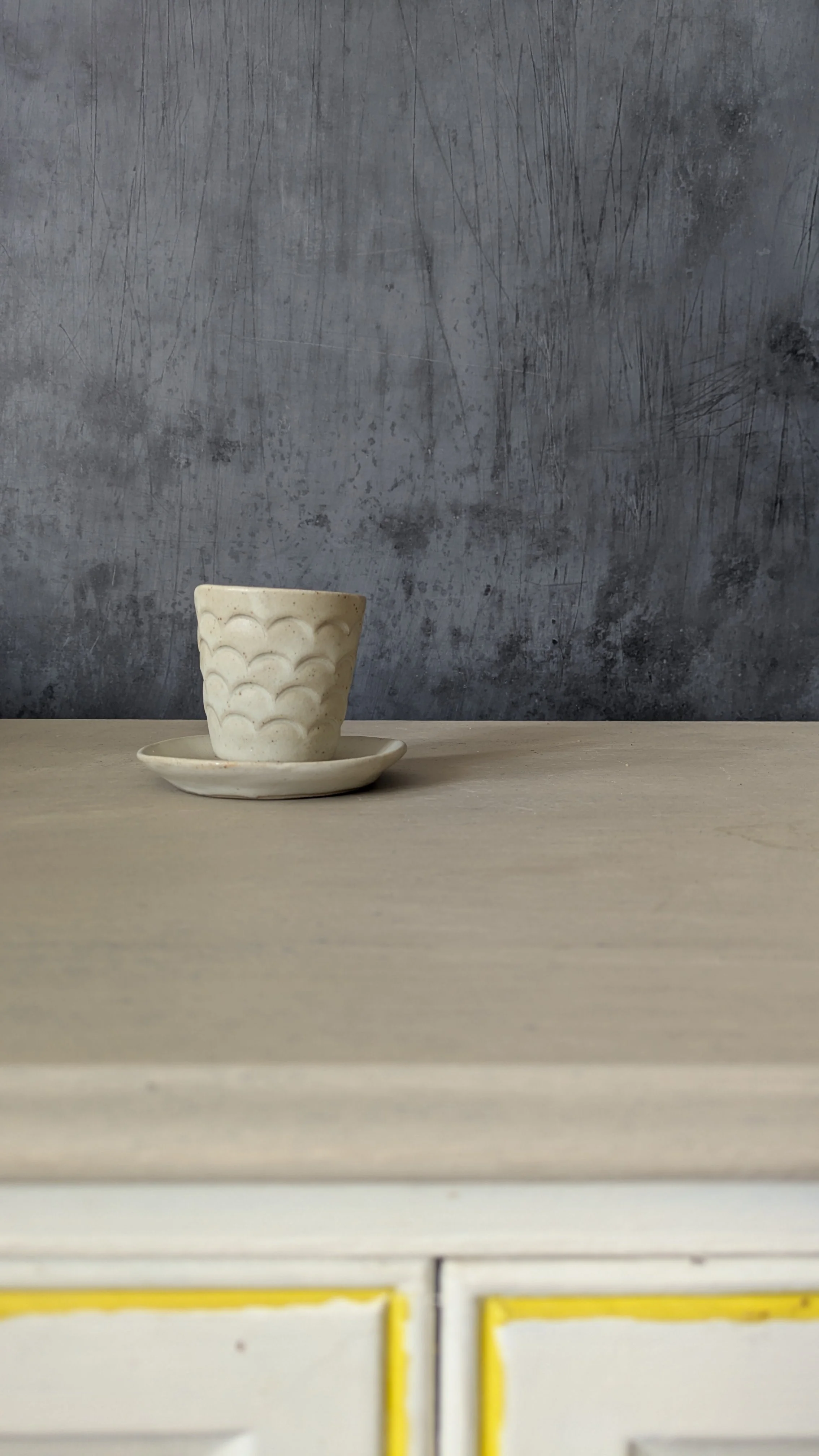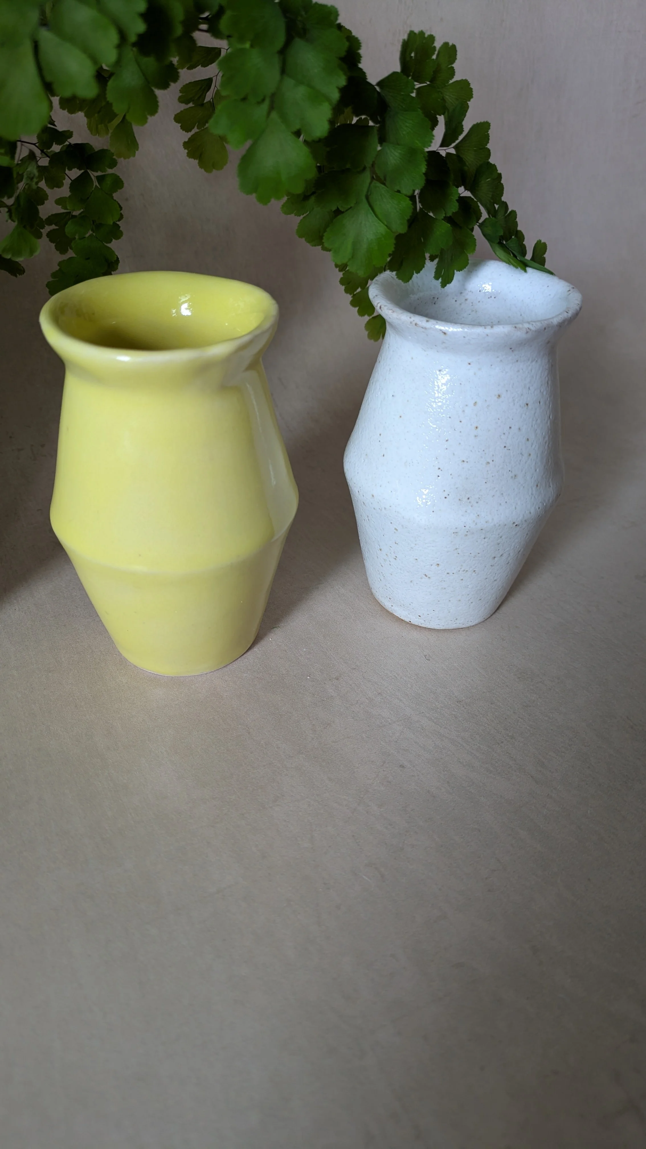 • I use three types of stoneware clay, a light buff coloured clay, a darker buff with speckles, and a white clay. Each one allows a play of varying effects with my chosen glazes. Non of the glazes I use contain lead or cadmium and are suitable for tableware . Any ceramic pieces with glass are to be used as decorative pieces only, please do not eat food off these surfaces.